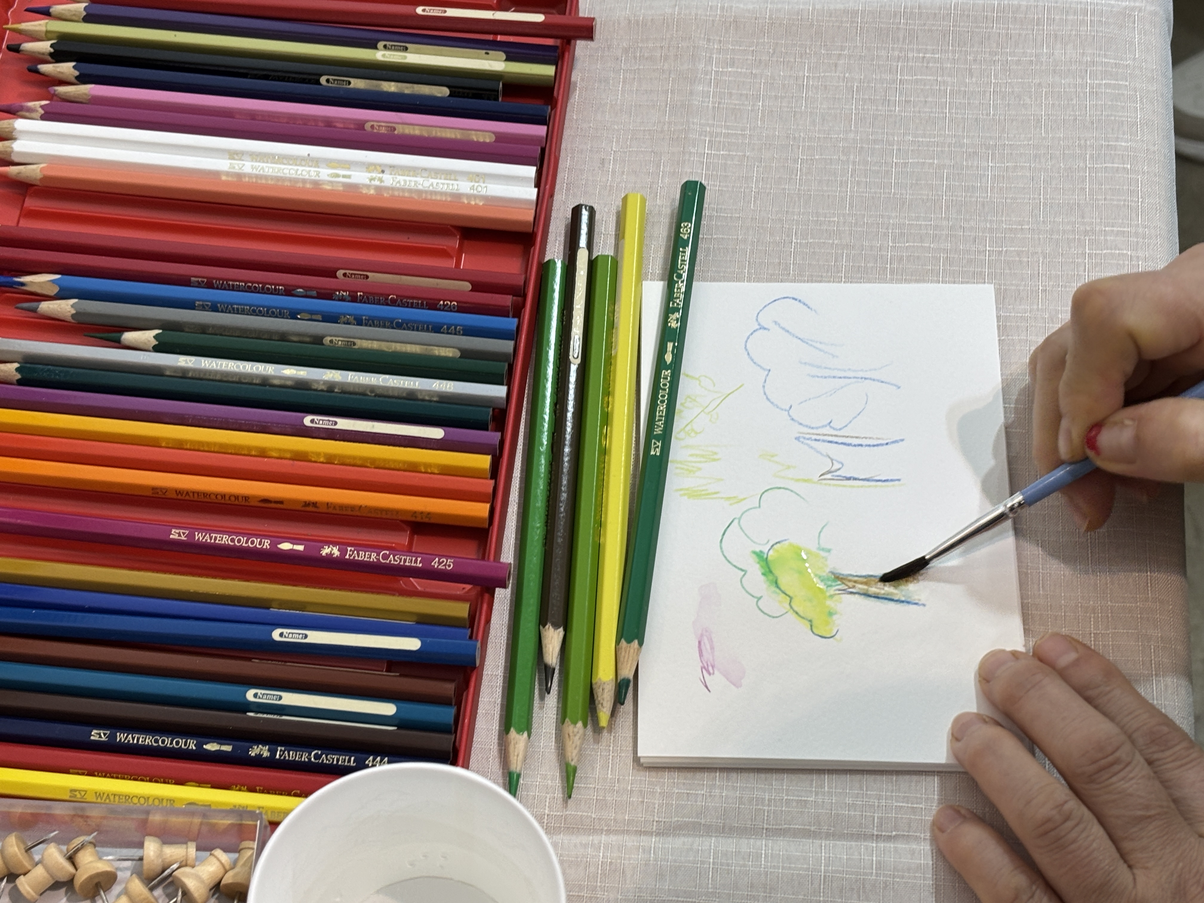 벽에 걸린 작품을 감상하고, 바로 옆 테이블에서 나만의 수채색연필화를 그려보아요.