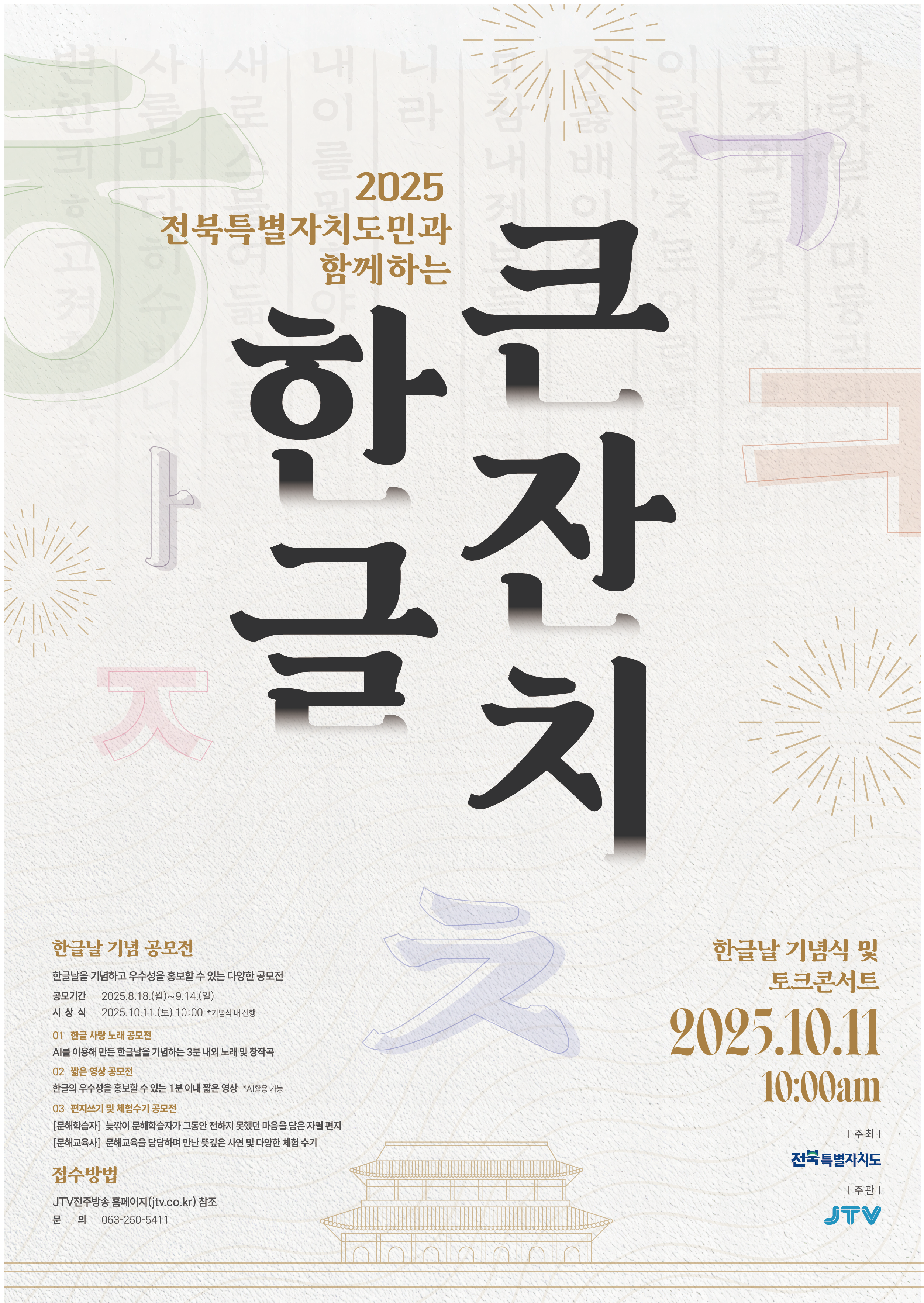 - 우편 접수 : (54859) 전북 전주시 덕진구 정여립로 1083 JTV전주방송 한글큰잔치 담당자 앞