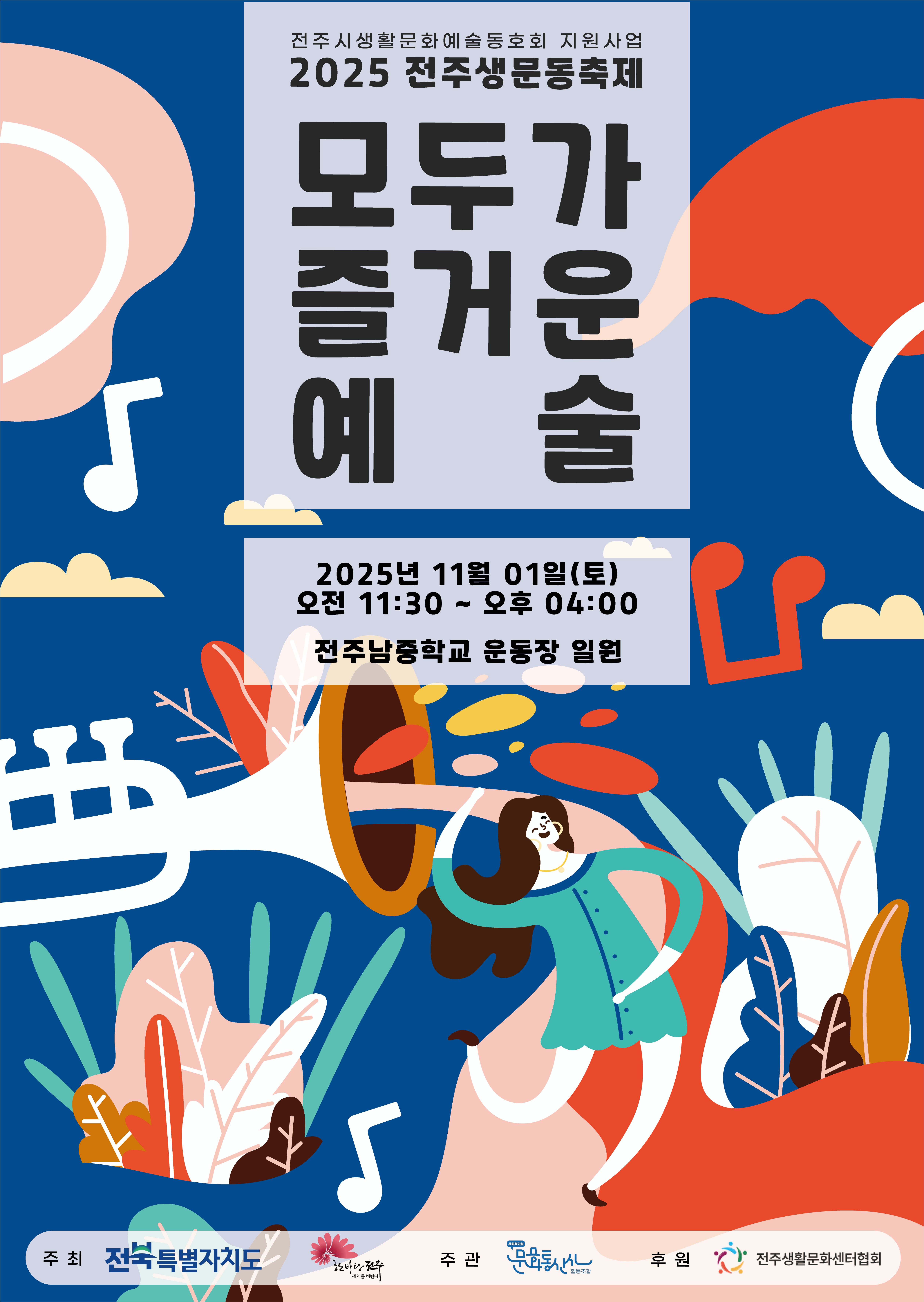 2025 전주생문동축제 '모두가 즐거운 예술'이 오는 2025.11.1.(토) 11:30~16:00/전주남중학교 운동장 일원에서 펼쳐집니다.