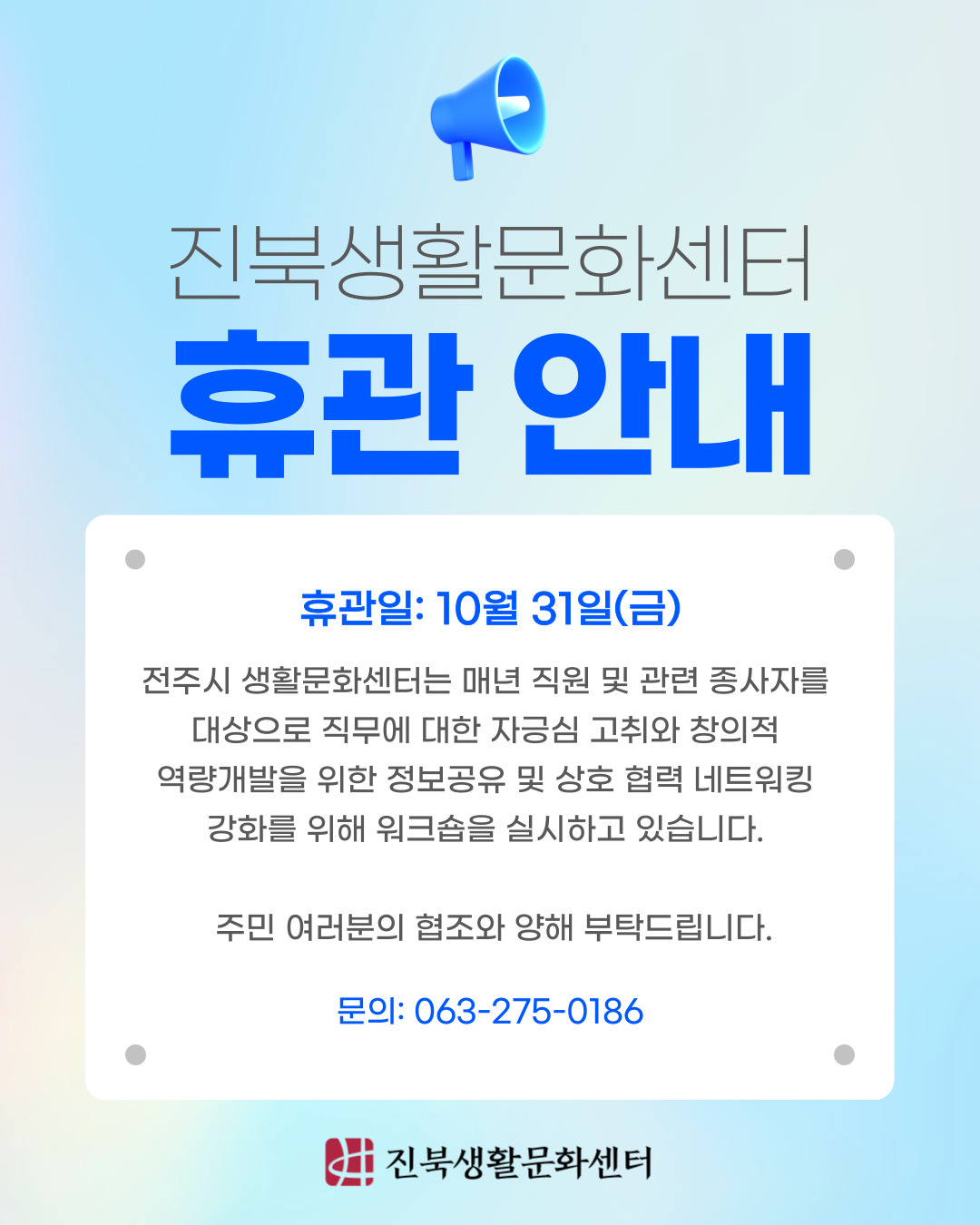 휴 관 일 : 2025. 10. 31.(금)휴관사유 : 전주시 생활문화센터 종사자 역량강화 워크숍