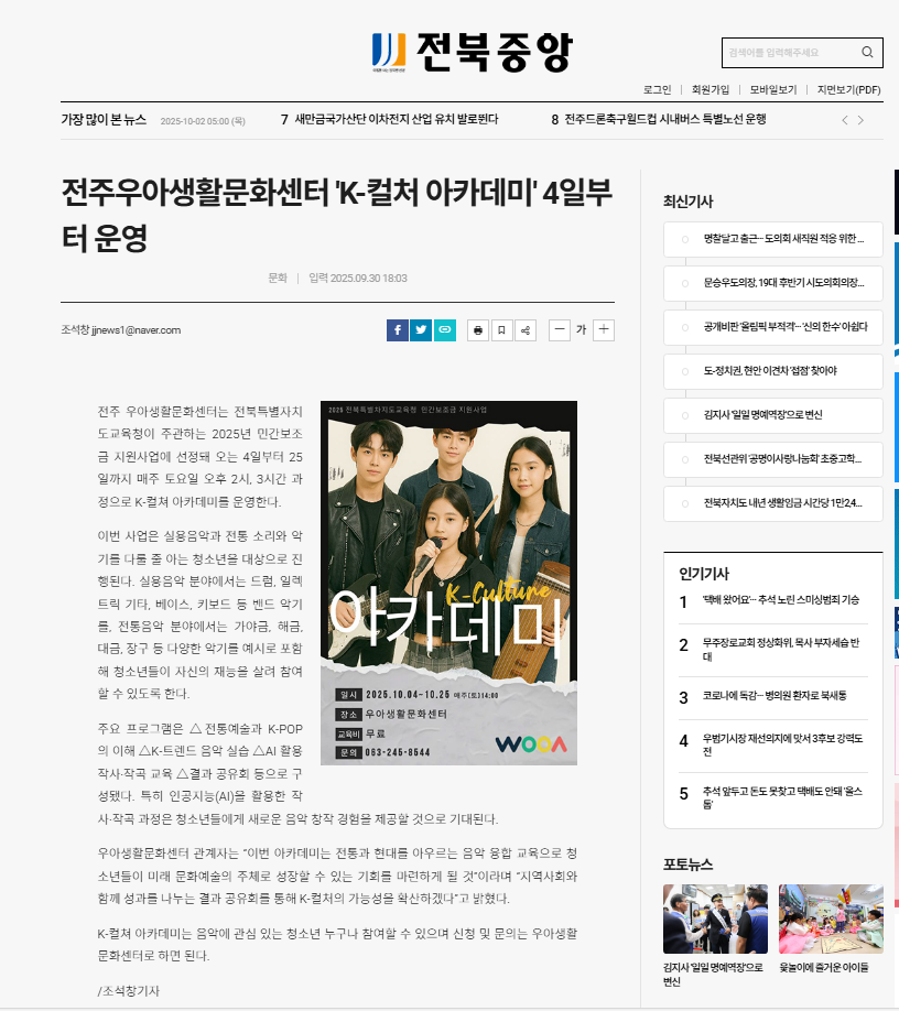 전주 우아생활문화센터는 전북특별자치도교육청이 주관하는 2025년 민간보조금 지원사업에 선정돼 오는 4일부터 25일까지 매주 토요일 오후 2시, 3시간 과정으로 K-컬쳐 아카데미를 운영한다.
