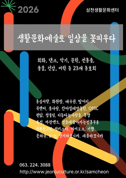 [삼천생활문화센터 공고 제2026-01호]2026년 삼천생활문화센터 생활문화프로그램 모집 공고"당신 곁에, 삼천생활문화센터!"일상이 매력으로 채워지는 생활문화 프로그램을제안받고자 하오..