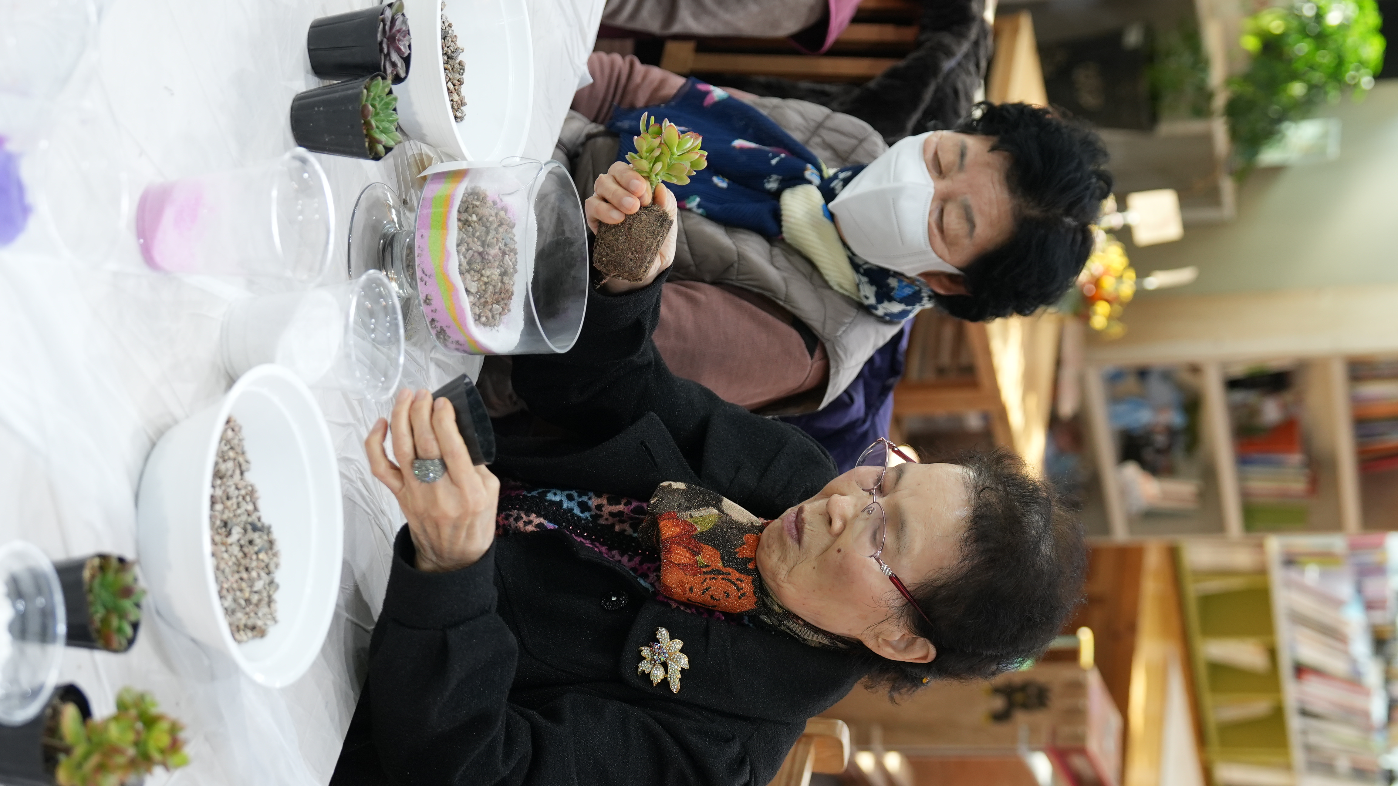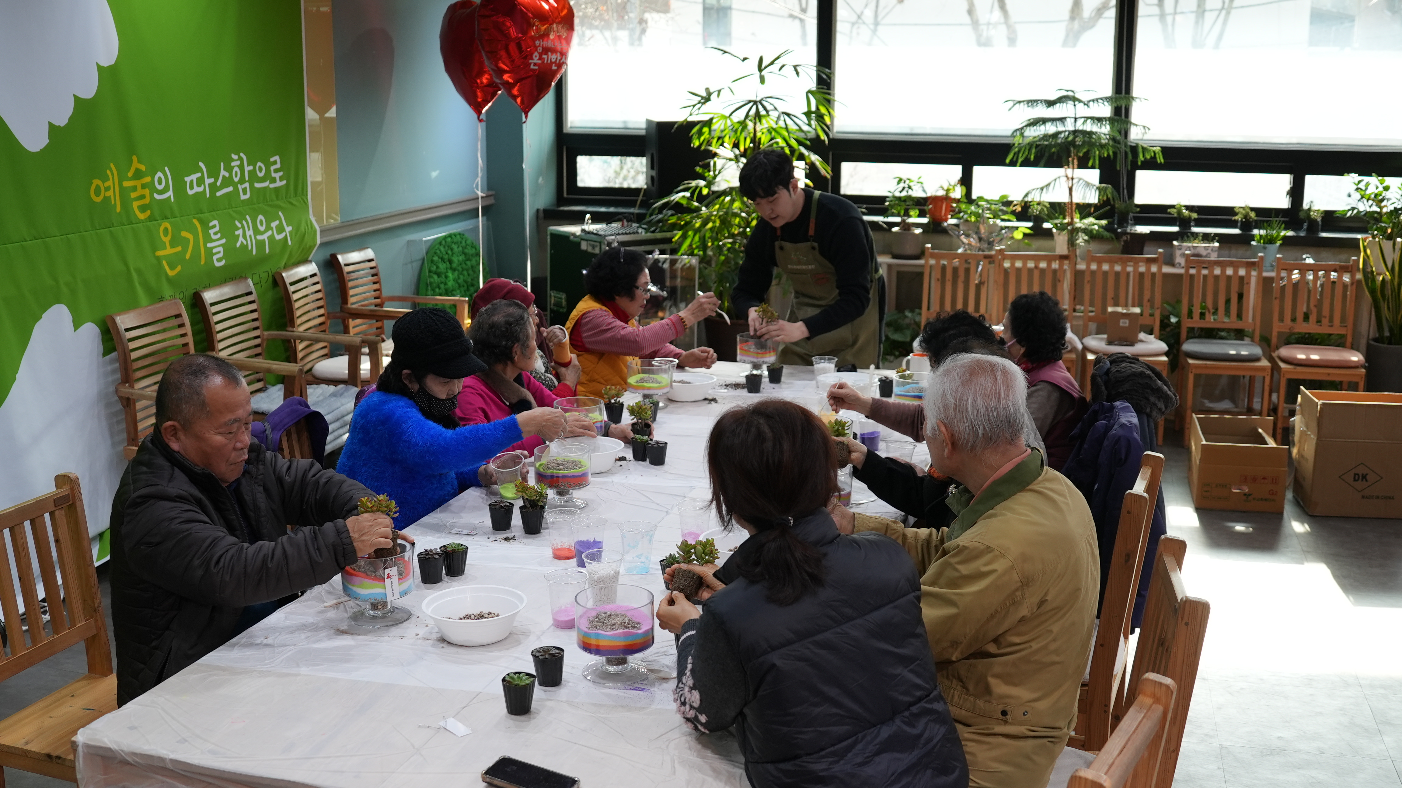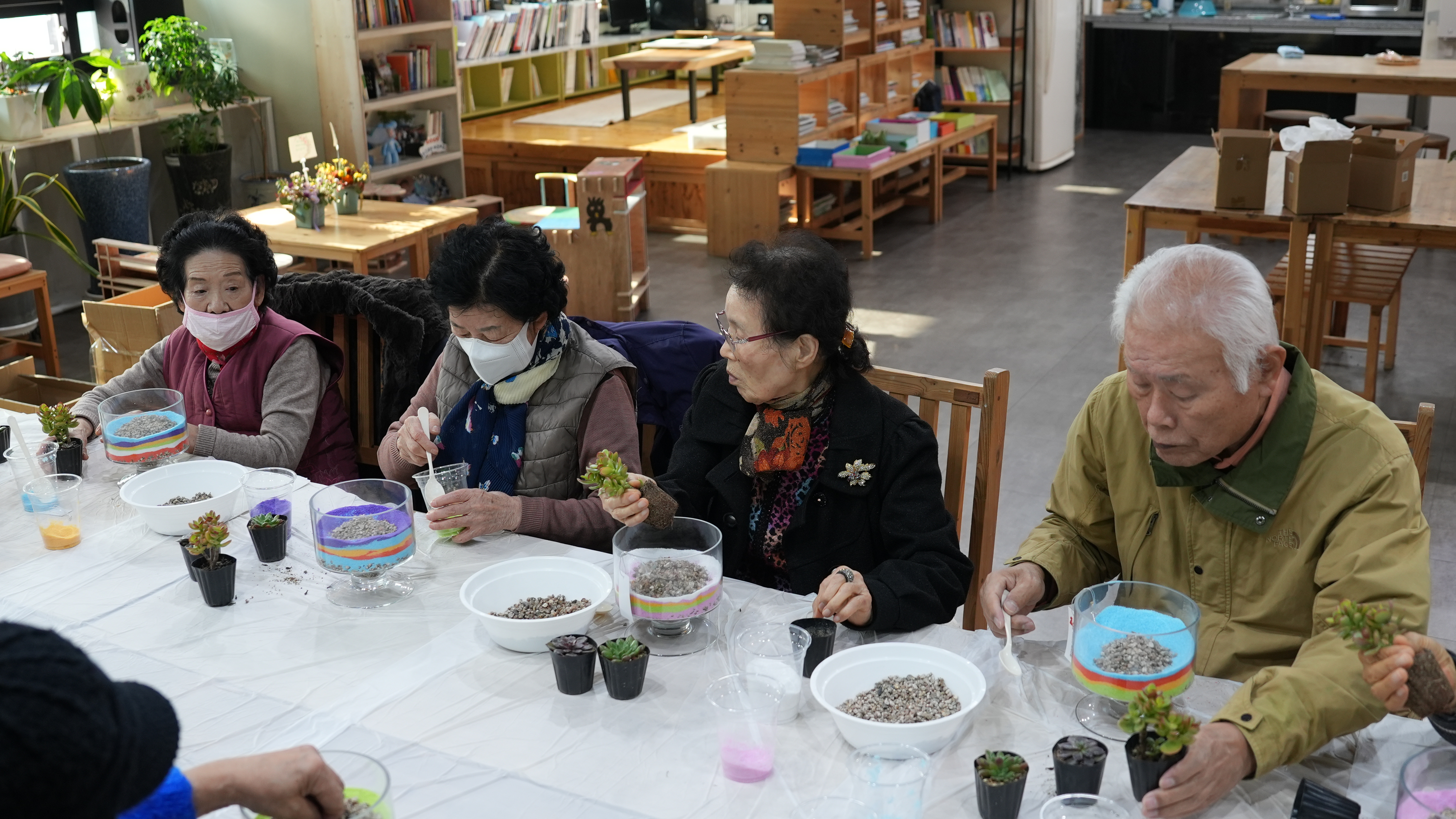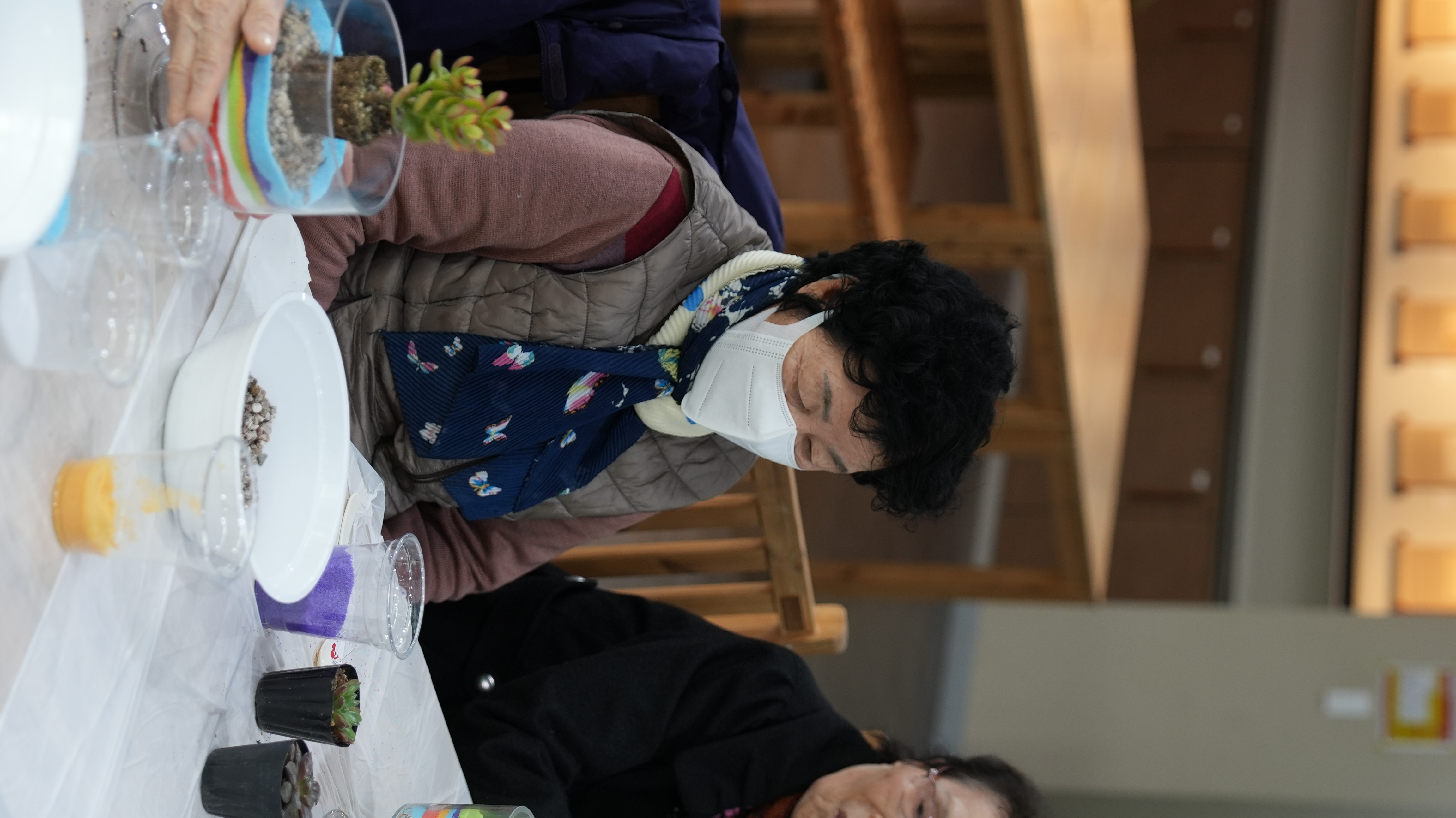 어르신들은 강사님의 설명에 귀를 기울이며, 투명한 화분 속에 알록달록 고운 색깔 모래를 한 층 한 층 정성스럽게 쌓아 올렸는데요? 같은 재료지만 어르신마다 각기 다른 색 조합으로 개성 넘치는 테라리움을 완성하셨습니다 :)