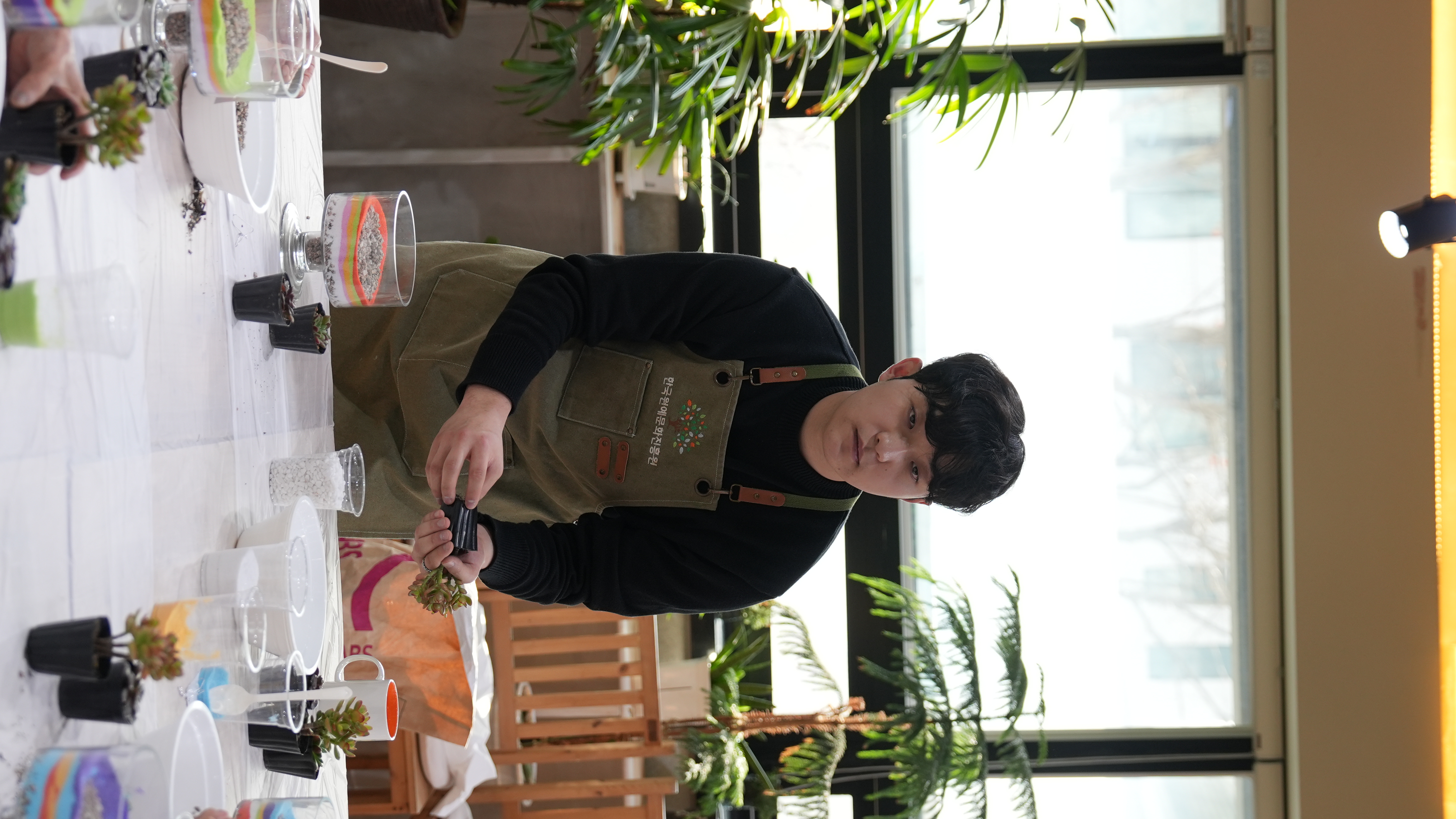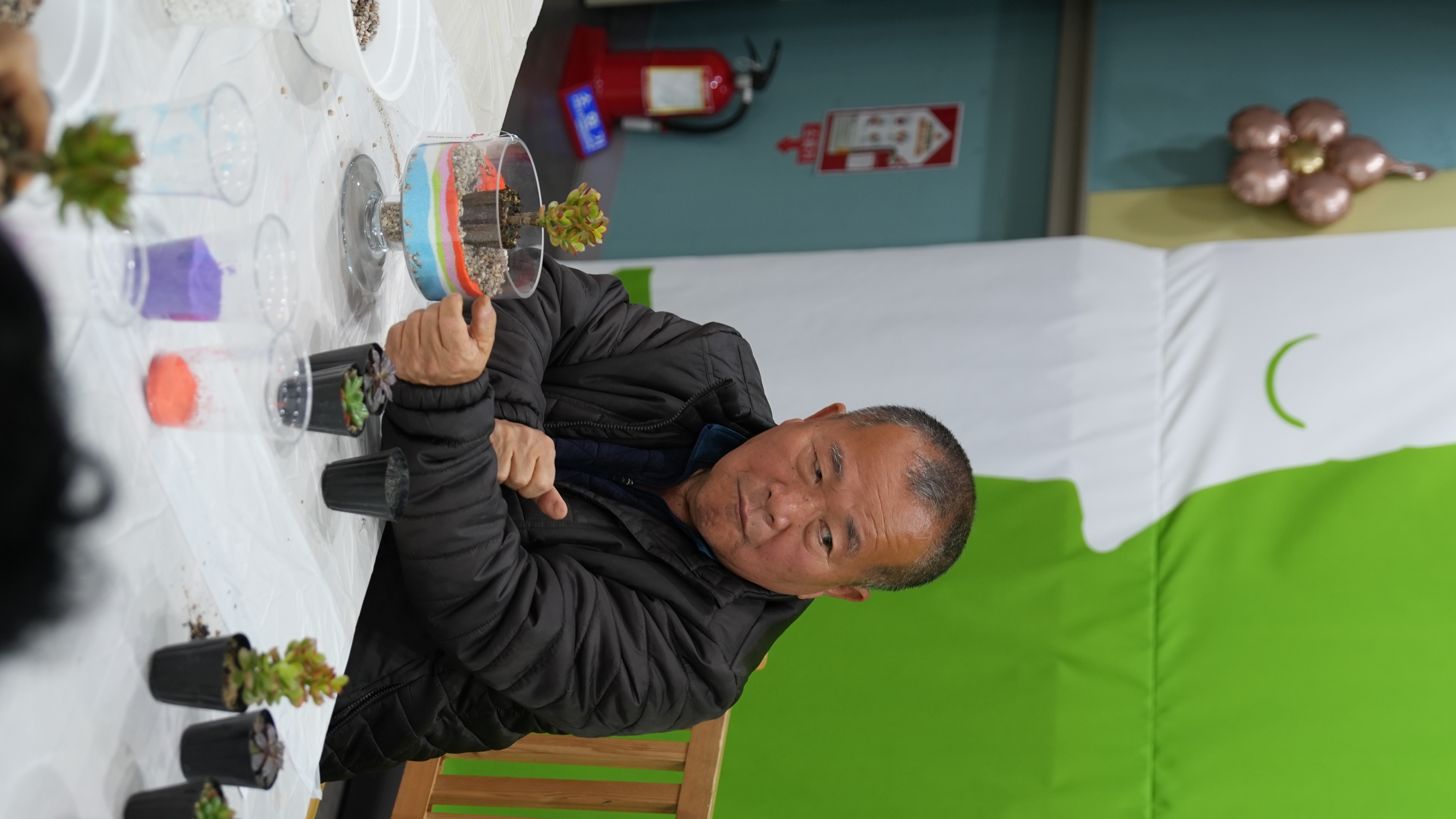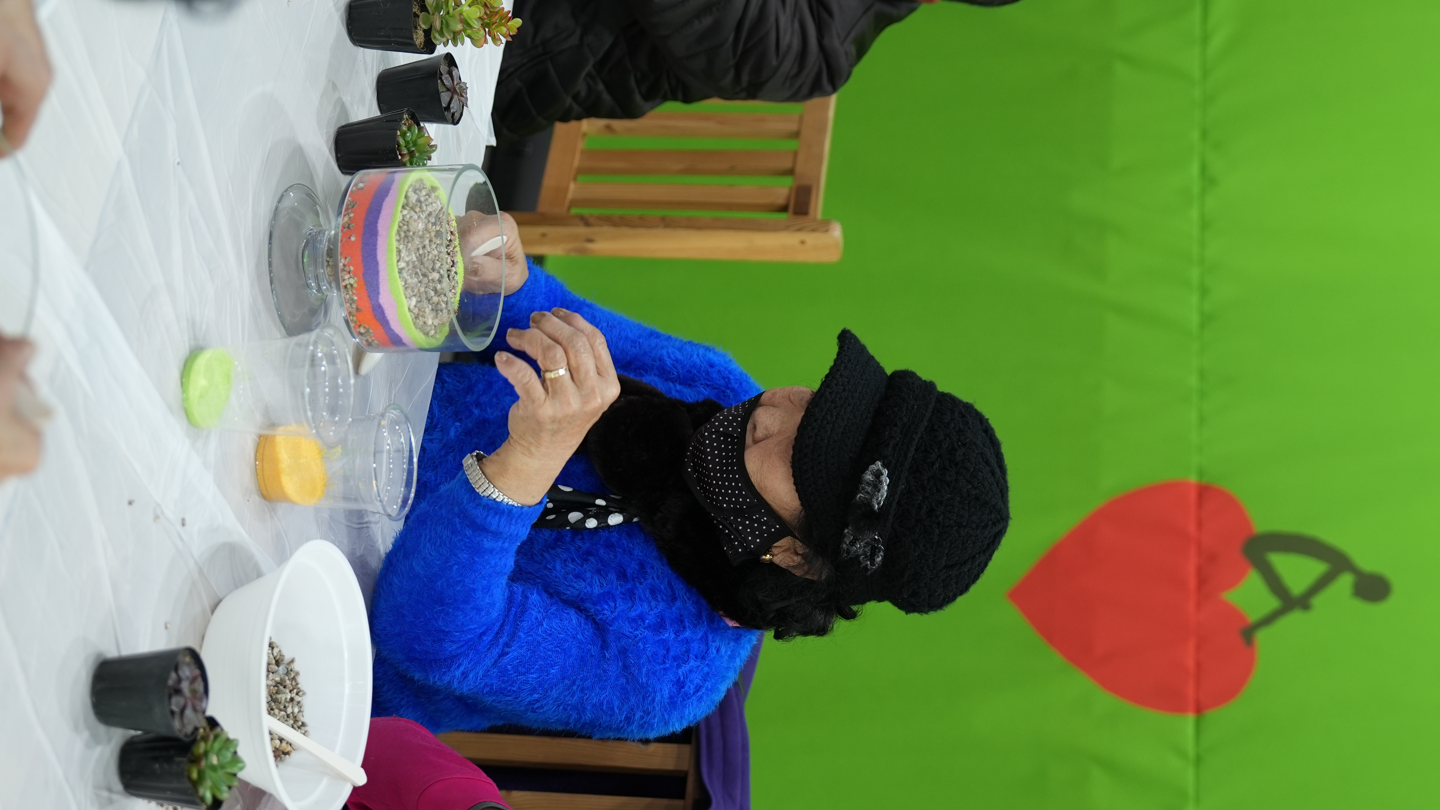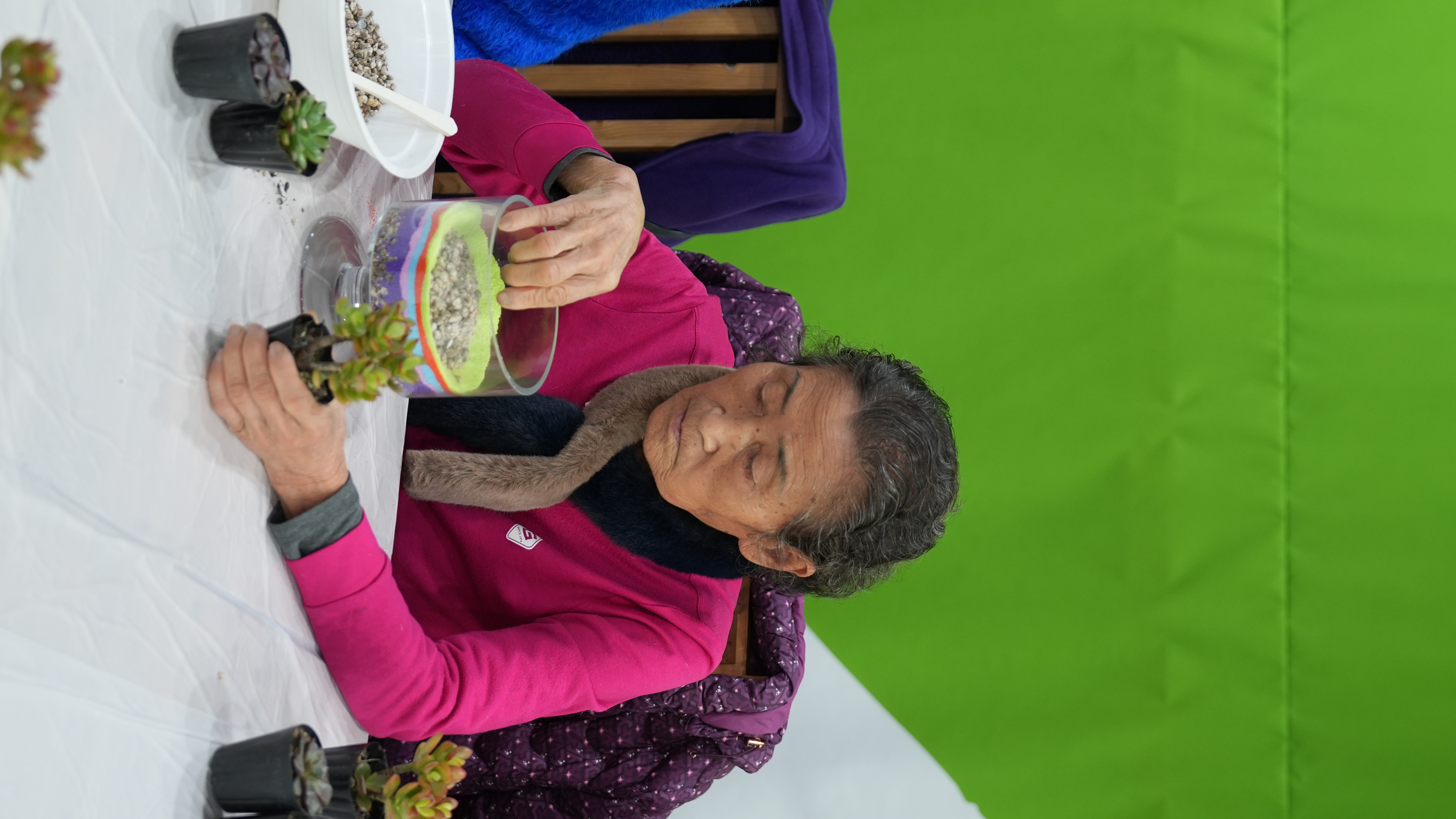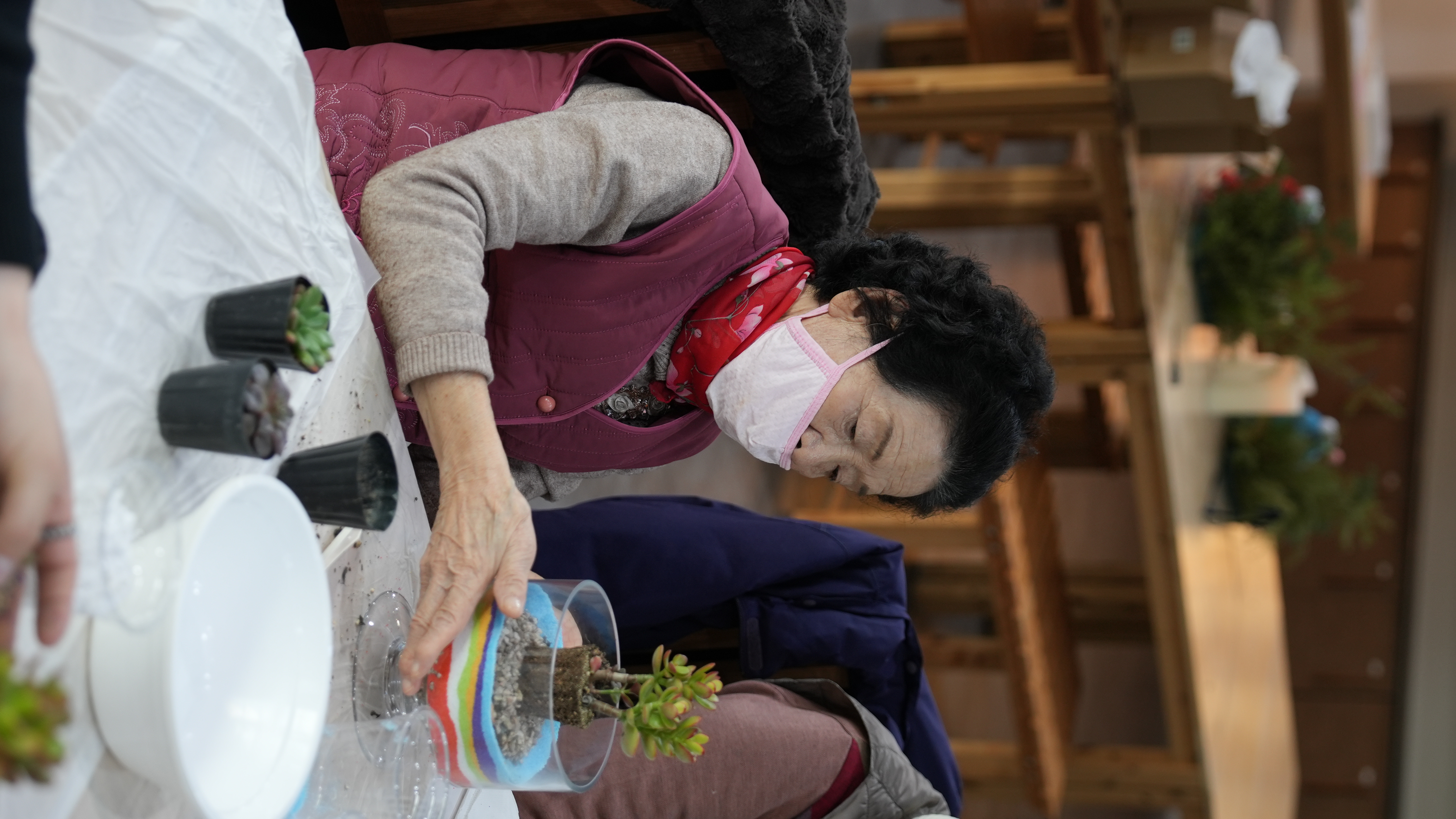 어르신들은 강사님의 설명에 귀를 기울이며, 투명한 화분 속에 알록달록 고운 색깔 모래를 한 층 한 층 정성스럽게 쌓아 올렸는데요? 같은 재료지만 어르신마다 각기 다른 색 조합으로 개성 넘치는 테라리움을 완성하셨습니다 :)