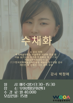 우아생활문화센터에서 <펜화 오후반>을 새롭게 개설합니다.정교한 선과 섬세한 표현으로 완성되는 펜화의 매력을 기초부터 심화까지 단계별로 배워보세요.✔️수업 시간:매주 <..