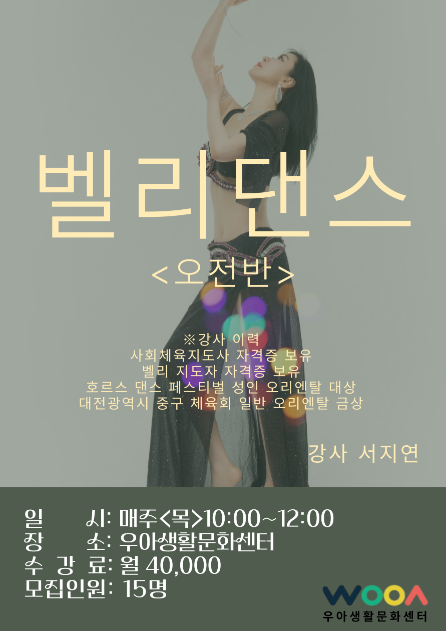 우아생활문화센터에서 열리는 벨리댄스 프로그램에 여러분을 초대합니다! 이 프로그램은 초보자부터 경험자까지 모두를 환영하며, 매주 두 번의 수업을 통해 벨리댄스의 기초부터 다양한 동작을 배우게 됩니다. 벨리댄스는 몸의 균형과 유연성을 길러줄 뿐만 아니라, 여성스러운 매력을 극대화할 수 있는 운동입니다. 이 시간을 통해 일상의 스트레스를 해소하고, 내면의 자신감을 발견해보세요.