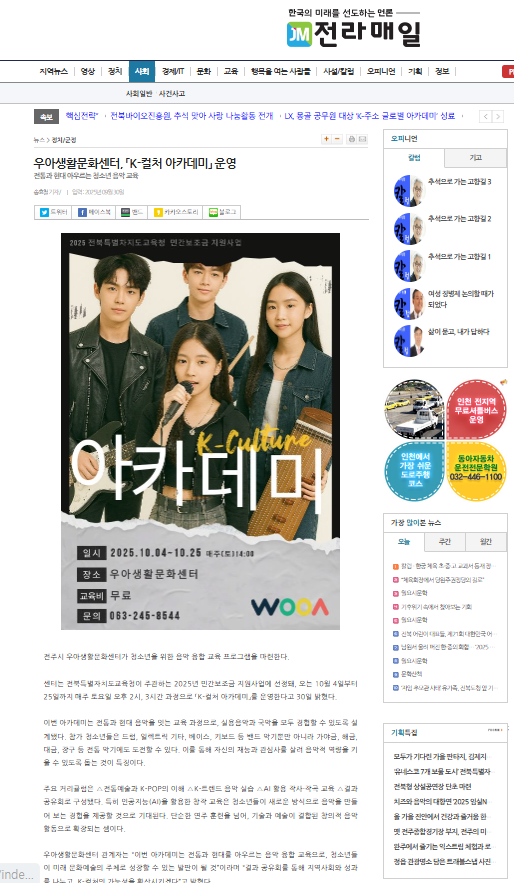 | 전주시 우아생활문화센터가 청소년을 위한 음악 융합 교육 프로그램을 마련한다. 센터는 전북특별자치도교육청이 주관하는 2025년 민간보조금 지원사업에 선정돼, 오는 10월 4일부터 25일까지 매주 토요일 오후 2시, 3시간 과정으로 「K-컬처 아카데미」를 운영한다고 30일 밝혔다. 이번 아카데미는 전통과 현대 음악을 잇는 교육 과정으로, 실용음악과 국악을 모두 경험할 수 있도록 설계됐다. 참가 청소년들은 드럼, 일렉트릭 기타, 베이스, 키보드 등 밴드 악기뿐만 아니라 가야금, 해금, 대금, 장구 등 전통 악기에도 도전할 수 있다. 이를 통해 자신의 재능과 관심사를 살려 음악적 역량을 키울 수 있도록 돕는 것이 특징이다. 주요 커리큘럼은 △전통예술과 K-POP의 이해 △K-트렌드 음악 실습 △AI 활용 작사·작곡 교육 △결과 공유회로 구성됐다. 특히 인공지능(AI)을 활용한 창작 교육은 청소년들이 새로운 방식으로 음악을 만들어 보는 경험을 제공할 것으로 기대된다. 단순한 연주 훈련을 넘어, 기술과 예술이 결합된 창의적 음악 활동으로 확장되는 셈이다. 우아생활문화센터 관계자는 “이번 아카데미는 전통과 현대를 아우르는 음악 융합 교육으로, 청소년들이 미래 문화예술의 주체로 성장할 수 있는 발판이 될 것”이라며 “결과 공유회를 통해 지역사회와 성과를 나누고, K-컬처의 가능성을 확산시키겠다”고 밝혔다. 「K-컬처 아카데미」는 음악에 관심 있는 청소년이라면 누구나 참여할 수 있으며, 참가 신청 및 문의는 우아생활문화센터(063-245-8455)로 하면 된다. |